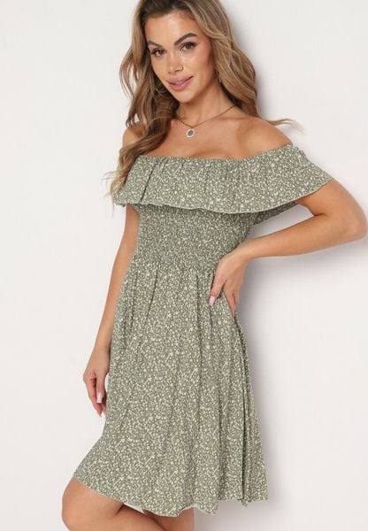 Zielona Bawełniana Sukienka z Hiszpańskim Dekoltem i Marszczoną Górą w Kwiaty Samorea