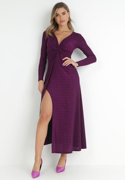 Ciemnofioletowa Sukienka z Marszczeniem przy Dekolcie Metaliczna Sisio