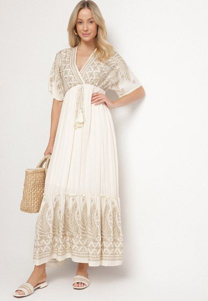 Jasnobeżowa Wiskozowa Sukienka z Kopertowym Dekoltem i Haftem z Metaliczną Nicią Emhiris