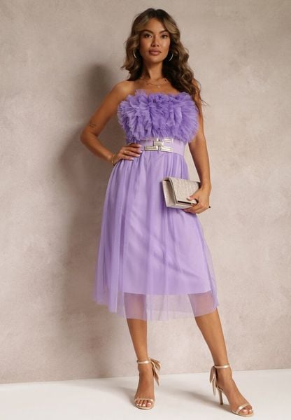 Fioletowa Tiulowa Sukienka bez Ramiączek z Falbankami Tremone