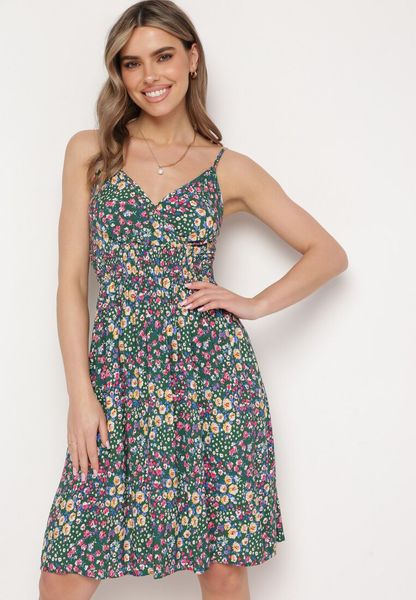Zielona Sukienka z Wiskozy w Drobne Kwiatki z Regulowanymi Ramiączkami i Gumką w Talii Wiadina
