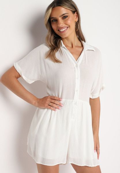 Biały Wiskozowy Kombinezon z Koszulową Górą Zapinany na Guziki z Krótkimi Spodniami Vikota