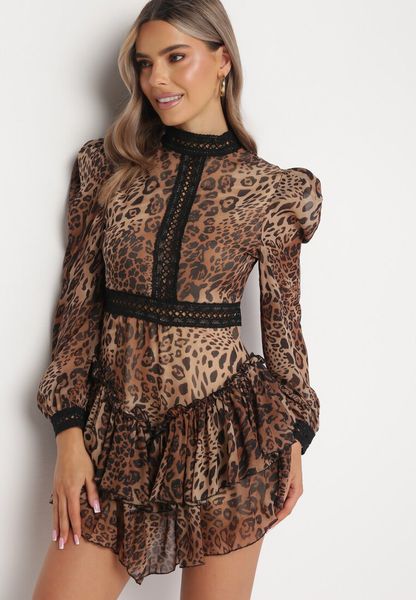 Brązowa Mini Sukienka o Rozkloszowanym Fasonie z Falbankami i Gumką w Talii Beranzze