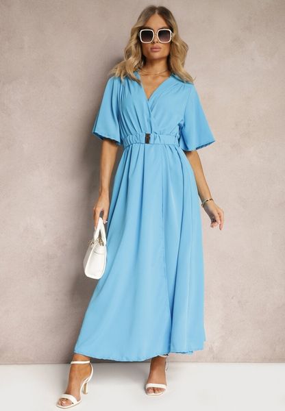 Niebieska Sukienka z Kopertowym Dekoltem z Gumką w Talii i Materiałowym Paskiem Xelovia