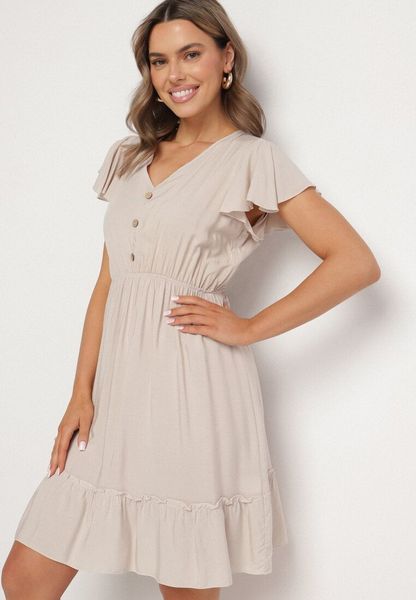 Jasnobeżowa Rozkloszowana Bawełniana Sukienka z Guzikami i Falbanami Natinema