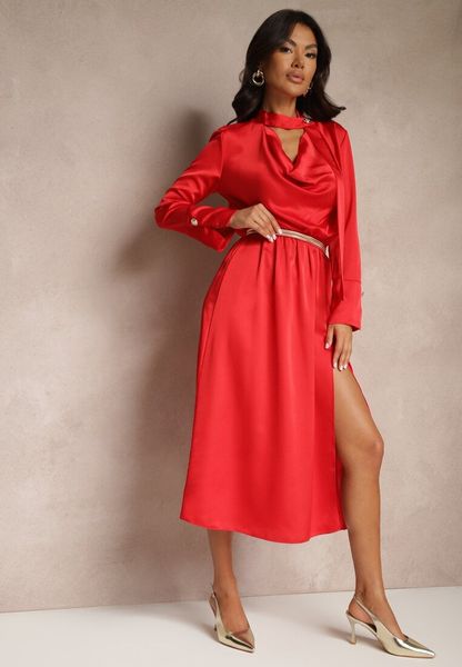 Czerwona Koktajlowa Sukienka z Satyny z Ozdobnym Guzikiem Leaneris