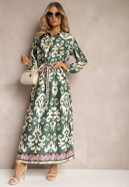Zielona Sukienka Satynowa o Pudełkowym Fasonie Wiązana w Talii w Ornamentalny Wzór Narosa