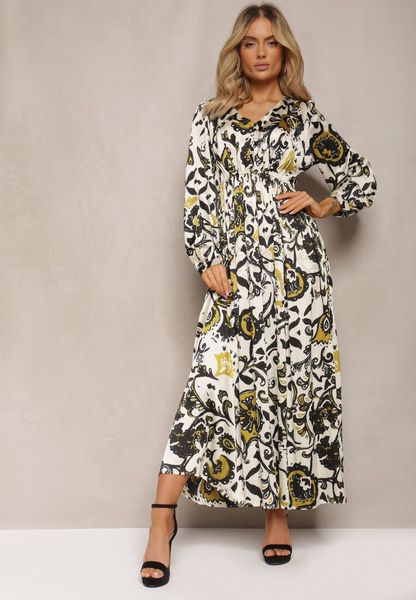 Beżowo-Zielona Długa Sukienka z Satyny z Gumką w Pasie i Ornamentalnym Printem Anoitia