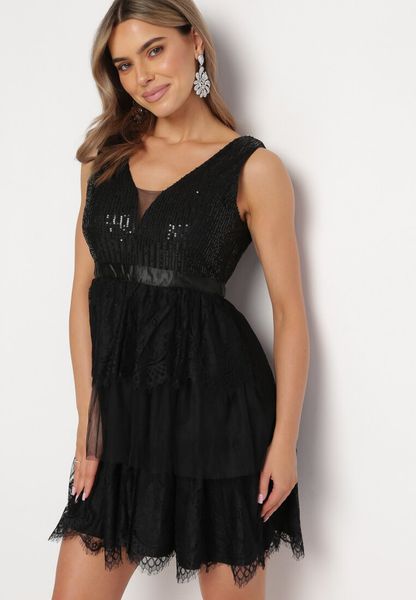 Czarna Rozkloszowana Sukienka Mini z Tiulowym Dołem i Cekinami Uriella