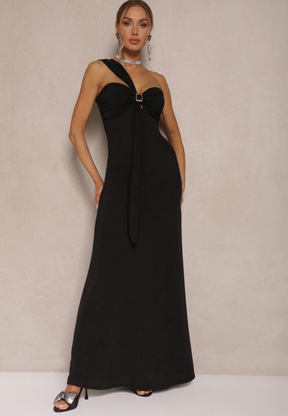 Czarna Asymetryczna Sukienka Koktajlowa Ozdobiona Metaliczną Aplikacją Divianis