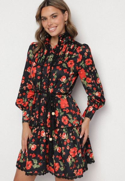 Sukienka Madalyn o koszulowym fasonie ze stójką. Zapinana na guziki do linii bioder, w pasie wiązana sznurkiem z frędzelkami. Gdzieniegdzie koronkowe wstawki. Na dole delikatna falbanka. Kwiecista, rozkloszowana sukienka Madalyn nie posiada podszewki.