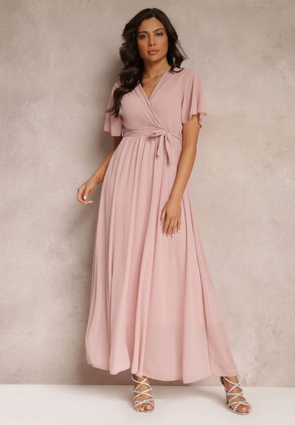 Różowa Plisowana Sukienka z Kopertowym Dekoltem i Gumką w Talii Dimitris