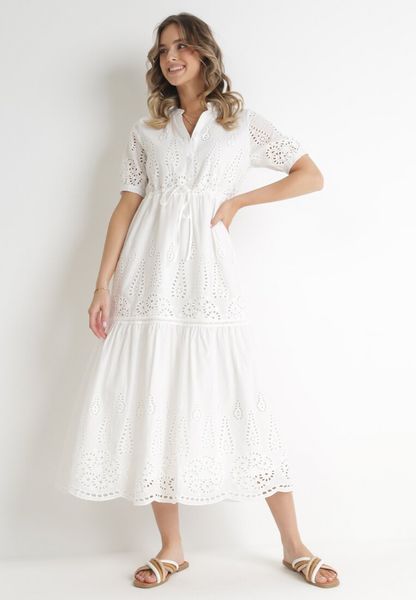 Biała Haftowana Sukienka Maxi ze Ściągaczem w Talii Erlina
