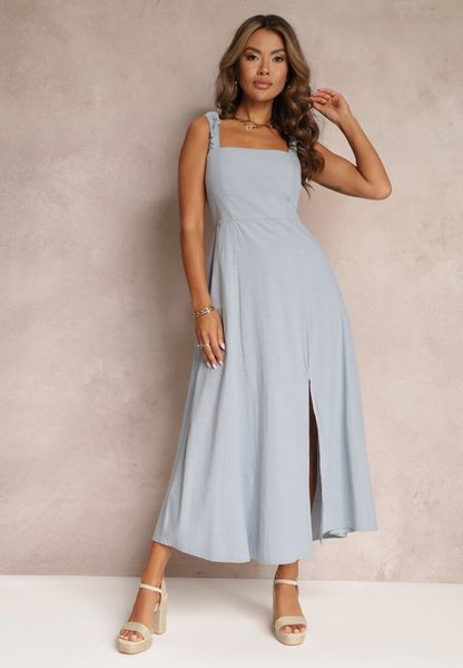 Jasnoniebieska Rozkloszowana Sukienka na Ramiączkach z Kwadratowym Dekoltem Sastorea