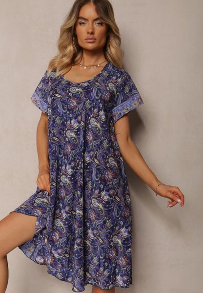 Granatowa Rozkloszowana Sukienka z Wiskozy w Kwiaty Rivanira