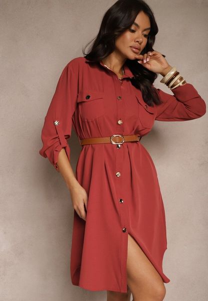 Bordowa Sukienka Koszulowa z Regulowanymi Rękawami i Paskiem w Talii Esarivia