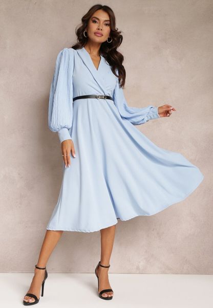 Jasnoniebieska Rozkloszowana Sukienka z Paskiem i Długim Rękawem Malaiyah