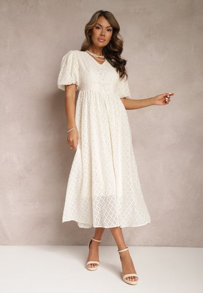 Sukienka Indiria o taliowanym kroju, z rozkloszowanym dołem. Długość maxi. Wykonana z haftowanej tkaniny. Posiada materiałową podszewkę. Przy dekolcie ozdobne guziki. Zapinana z tyłu na zamek błyskawiczny.