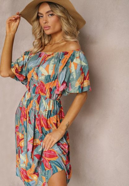 Zielono-Różowa Wiskozowa Sukienka na Lato z Podwójnymi Ramiączkami w Kwiatki z Gumką w Talii Triaire
