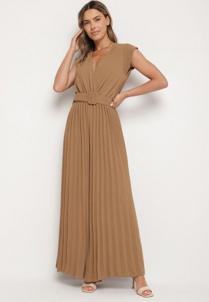 Ciemnobeżowy Kombinezon o Kopertowym Kroju z Plisami i Paskiem w Talii Salivania