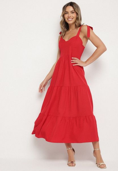 Czerwona Rozkloszowana Sukienka z Wiskozą Ozdobiona Wiązaniem na Ramiączkach Meravessa