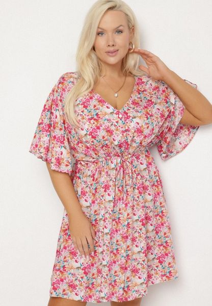 Różowa Sukienka z Wiskozy Ściągana w Talii w Kwiaty Liranette
