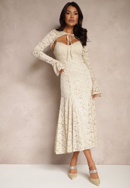 Beżowa Koronkowa Sukienka o Rozkloszowanym Kroju z Wiązanym Bolerkiem Gonneth