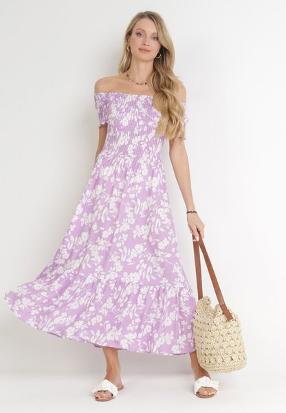 Kwiecista sukienka Ebothia o fasonie rozkloszowanej hiszpanki. Wykonana z marszczonej gumki. Nie posiada podszewki. Świetnie sprawdzi się zarówno do lekkich trampek, jak i sandałów.