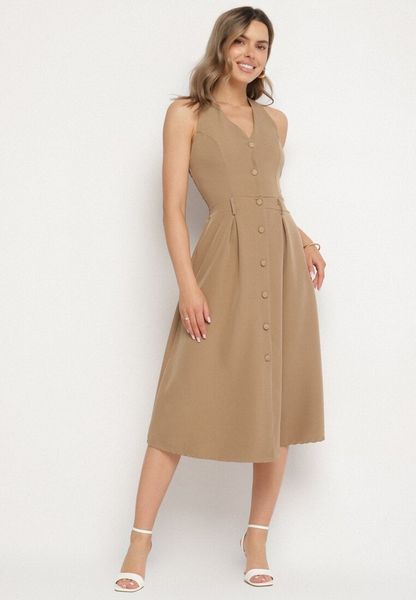 Ciemnobeżowa Sukienka na Szyję z Ozdobnymi Guzikami Folorea
