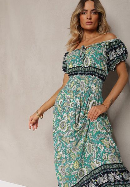 Zielona Wiskozowa Sukienka Maxi z Falbanką przy Dekolcie i Gumką w Pasie Lamimore