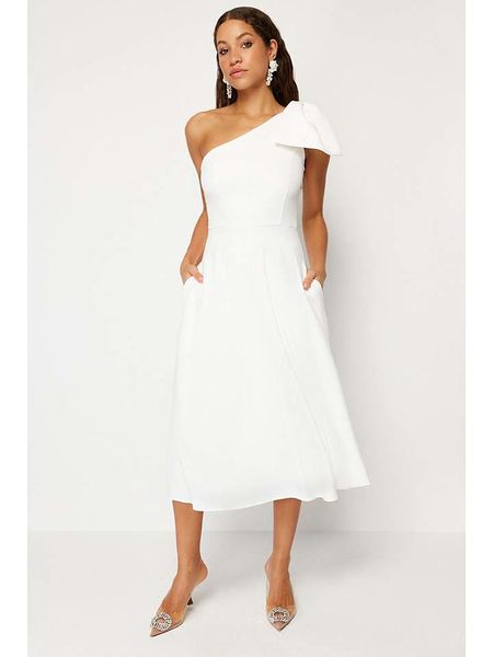 – krój rękawów: na jedno ramię- detale: przytwierdzone kokardki- zapięcie: suwak na plecach- kieszenie: wpuszczane- krój: rozkloszowany- look: jednokolorowy