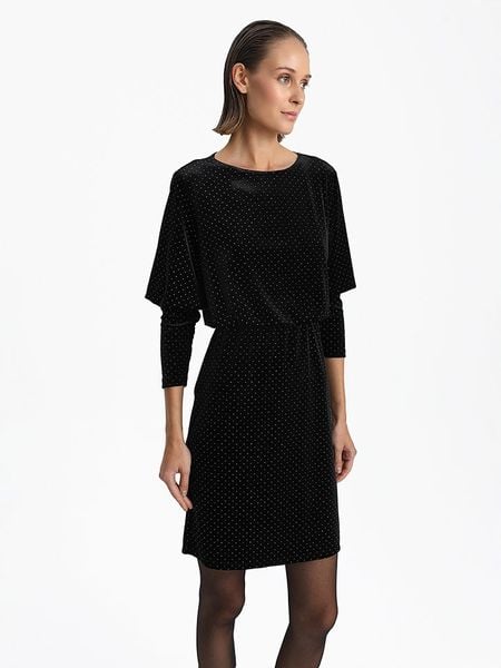 – dekolt: okrągły- rękaw: bufiasty- talia: elastyczna- krój: prosty- wzór: kropki