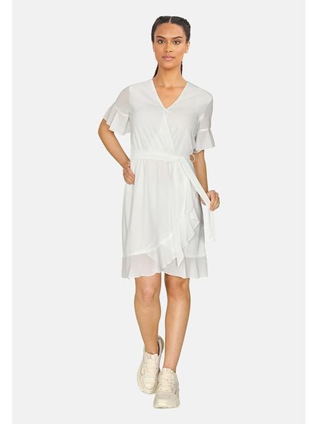– dekolt: V- krój rękawów: rozszerzany do dołu- szlufki na pasek: tak- zdejmowany pasek: tkanina- dolny brzeg: z falbankami- krój: taliowany- look: jednokolorowy