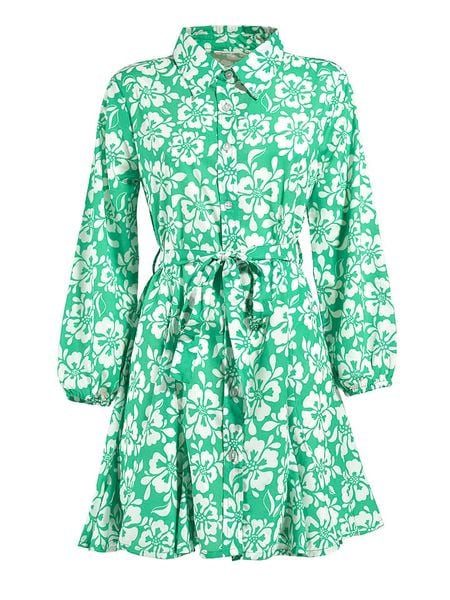 – kołnierz: kent- zapięcie: listwa guzikowa- rękaw: bufiasty- zdejmowany pasek: tkanina- krój: rozkloszowany- wzór: na całości