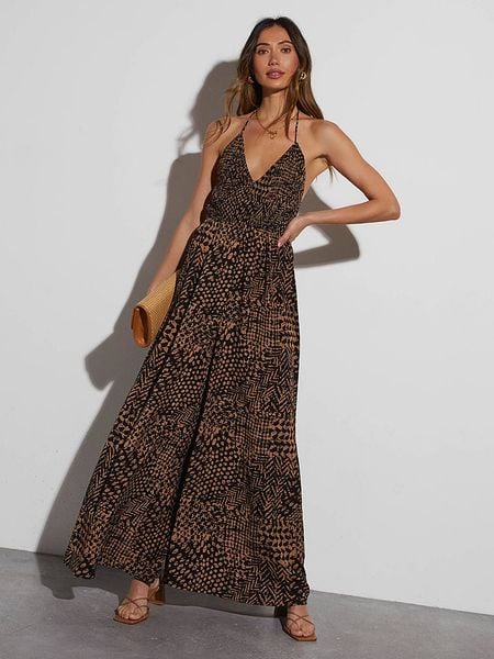 – ramiączka: na szyję- dekolt: V- zapięcie: wiązanie na plecach- krój: rozkloszowany- wzór: na całości