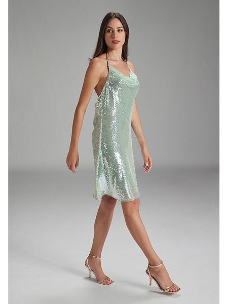 – ramiączka: na szyję- dekolt: kaskada- zapięcie: wiązanie na plecach- detale: cekiny- krój: prosty- look: jednokolorowy