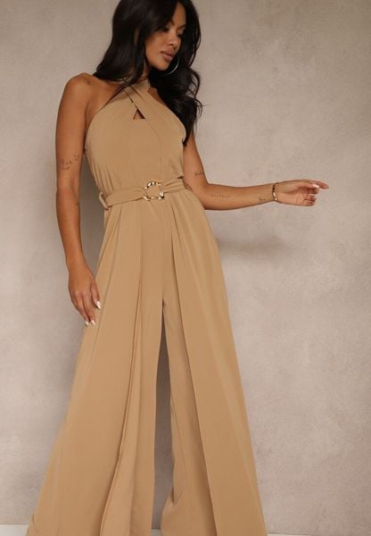Ciemnobeżowy Kombinezon Koktajlowy Ozdobiony Paskiem z Metaliczną Klamrą Zermira