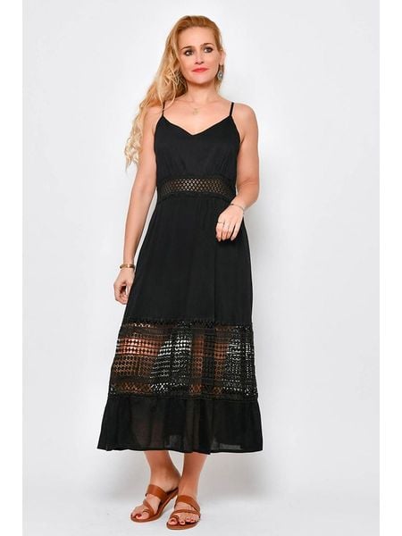 Czarna Bawełniana Sukienka Rozkloszowana z Koronką w Tropikalny Wzór Alusela