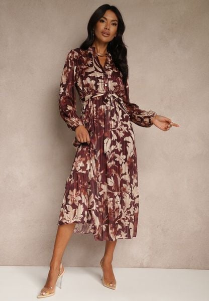 Bordowa Sukienka o Rozkloszowanym Kroju z Wiązanym Paskiem i Metaliczną Nicią Nalimirae