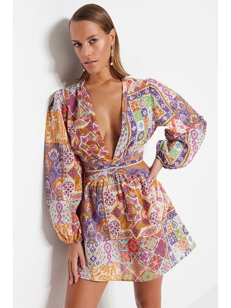 – czysta bawełna- dekolt: V- rękaw: bufiasty- zakończenie rękawów: elastyczne- w talii wiązanie: tak- detale: wycięcia- krój: litera A- wzór: mix