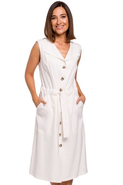 Swobodna, trapezowa sukienka zapinana na duże guziki, wykładany kołnierz, duże wsuwane kieszenie i pasek w talii. Wysokiej jakości materiał zapewni Ci wygodę i komfort.
