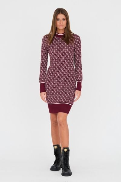Bordowa damska sukienka na co dzień, marki Guess.Wymiary modelki: wzrost 176 cm, biust 85 cm, talia 65 cm, biodra 92 cm. Modelka ma na sobie produkt w rozmiarze S.