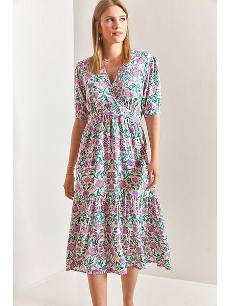– czysta wiskoza- dekolt: okrągły- długość rękawa: półdługi- krój: rozkloszowany- wzór: kwiatowy