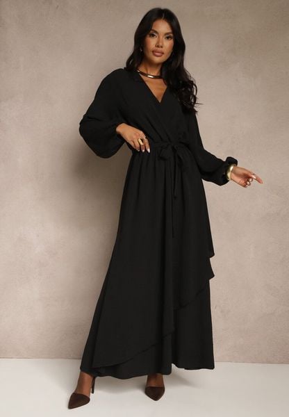 Czarna Asymetryczna Koktajlowa Sukienka z Wiskozą Kopertowym Dekoltem i Paskiem Laniea