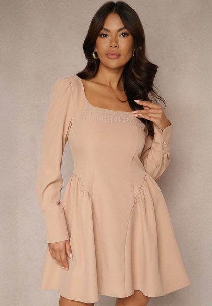 Beżowa Krótka Sukienka z Kwadratowym Dekoltem o Rozkloszowanym Fasonie Enadis