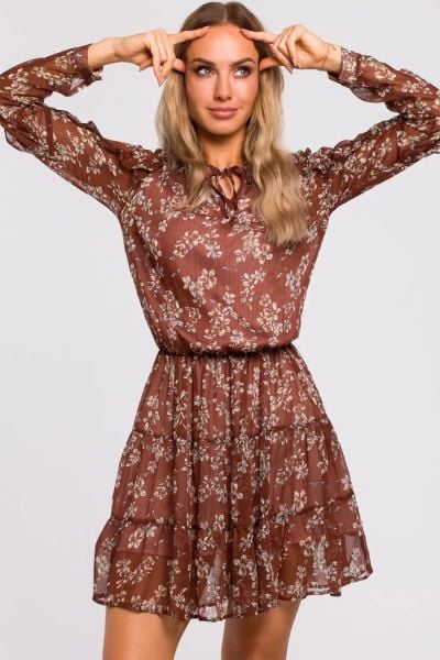Sukienka w kwiaty szyfonowa z falbankami w stylu BOHO brązowa mini