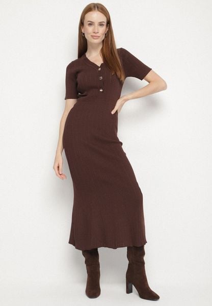 Brązowa Taliowana Sukienka Sweterkowa z Wiskozą i Metalicznymi Guzikami Lilianessa
