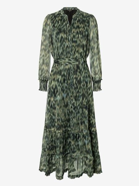 – z dodatkiem poliestru pochodzącego z recyklingu- dekolt: z rozcięciem- zapięcie: skrócona listwa guzikowa- rękaw: bufiasty- zakończenie rękawów: marszczenie- zdejmowany pasek: tkanina- dolny brzeg: z falbankami- krój: litera A- wzór: na całości