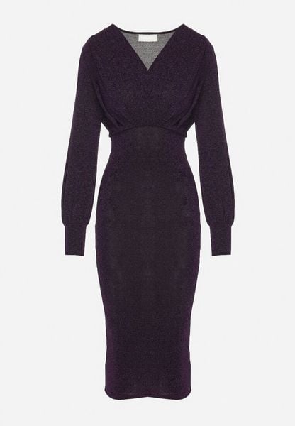 Fioletowa Dopasowana Sukienka z Kopertowym Dekoltem i Bufiastymi Rękawami Ulonissa