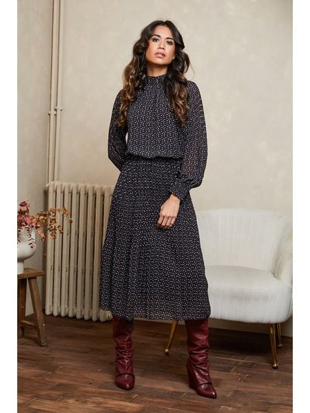 – kołnierz: stójka- zapięcie: guzik na plecach- talia: elastyczna- zakończenie rękawów: marszczenie- krój: taliowany- wzór: na całości